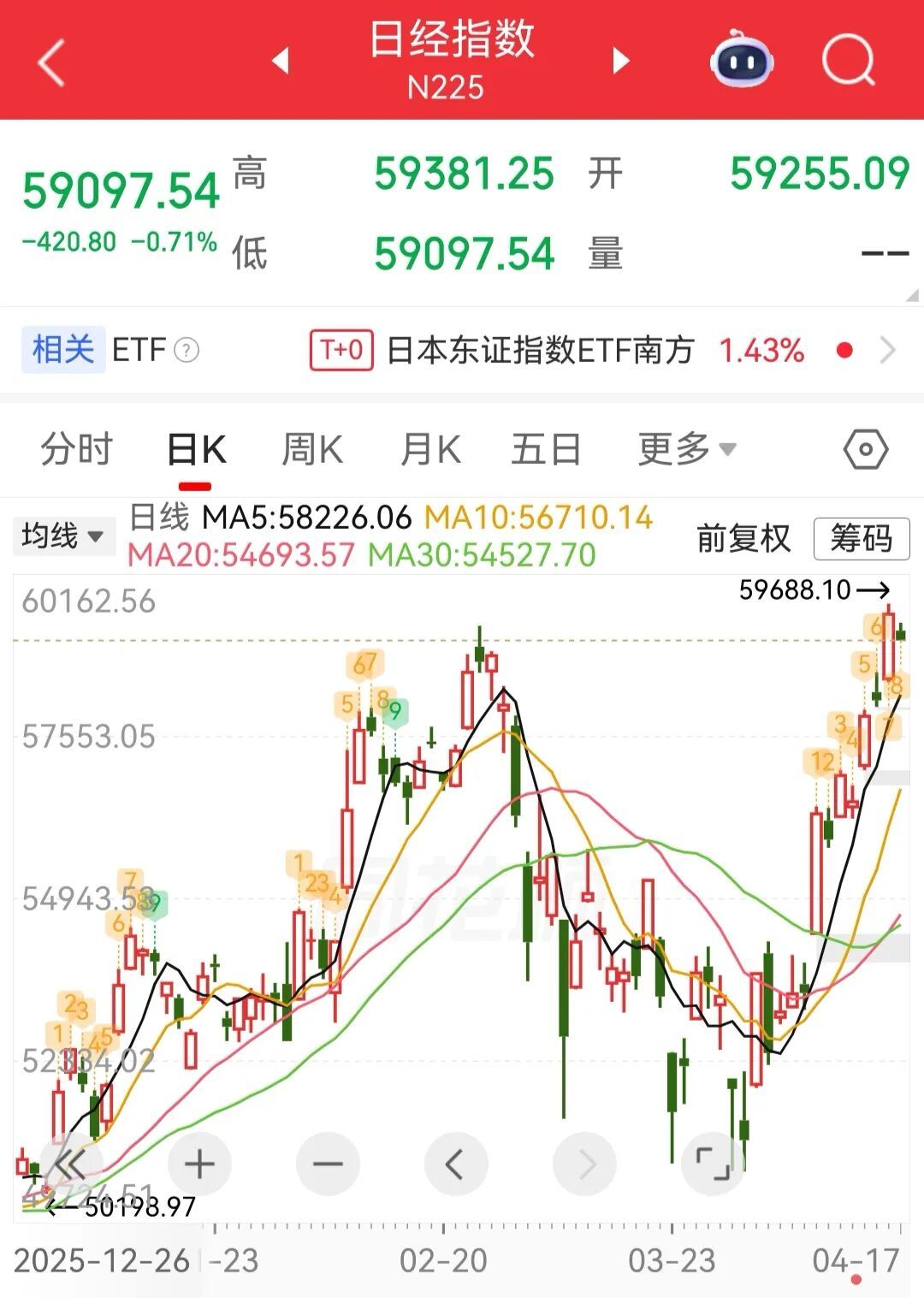 4月17日,日经225指数开盘下跌0.44%,报59255.09点;韩国KOSPI指数涨0.02%,报6227.33点。